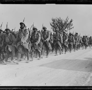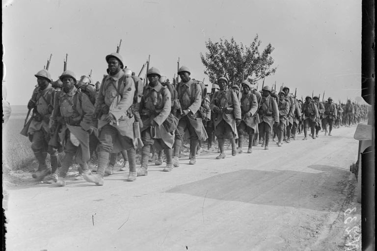 Sur la route de Verdun, des tirailleurs sénégalais marchent en direction du front. Photo : Pierre Pansier / ECPAD – domaine public