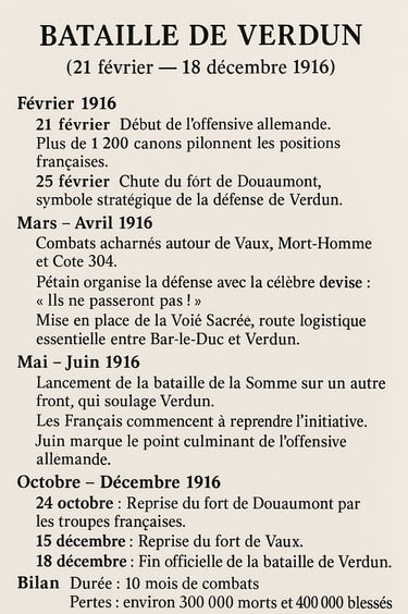 La bataille de Verdun, du 21 février au 18 décembre 1916, fut l’un des combats les plus meurtriers de la Première Guerre mondiale. Aux côtés des poilus français, des milliers de soldats venus des colonies — tirailleurs sénégalais, zouaves et spahis d’Afrique du Nord, Malgaches, Indochinois, Antillais ou Polynésiens — ont combattu avec courage dans des conditions terribles.